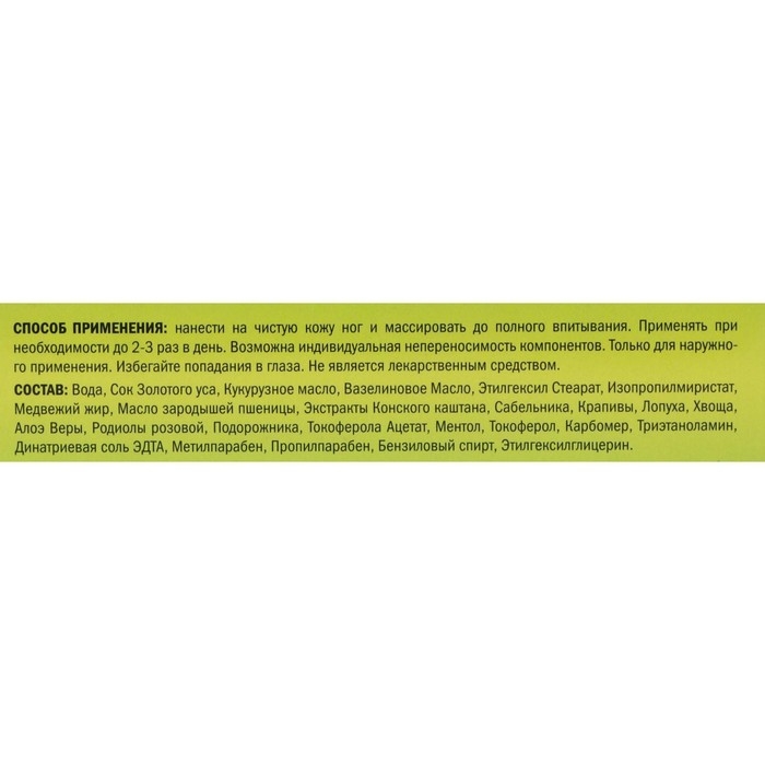 Состав: Вода, Сок Золотого уса, Кукурузное масло, Вазелиновое Масло, Этилгексил Стеарат, Изопропилмиристат, Медвежий жир, Масло зародышей пшеницы, Экстракты Конского каштана, Сабельника, Крапивы, Лопуха, Хвоща, Алоэ Веры, Родиолы розовой, Подорожника, Токоферола Ацетат, Ментол, Токоферол, Карбомер, Триэтаноламин, Динатриевая соль ЭДТА, Метилпарабен, Пропилпарабен, Бензиловый спирт, Этилгексилглицерин.