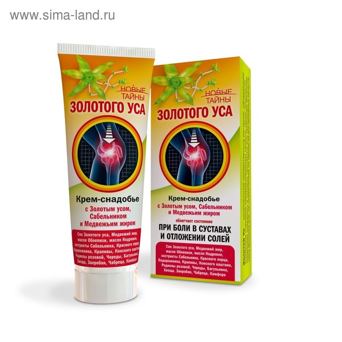 Крем-снадобье «Новые тайны золотого уса» снимает болевые ощущения в мышцах и суставах при отложении солей, а также нормализует их подвижность.