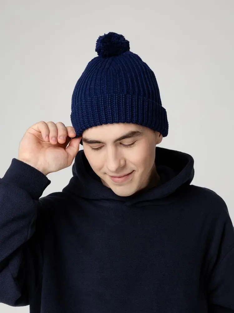 Однослойная шапка из высокообъемной пряжи с помпоном.