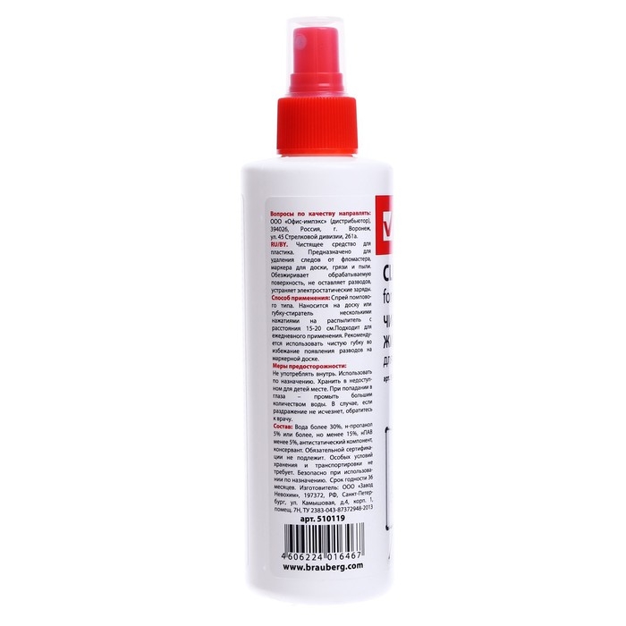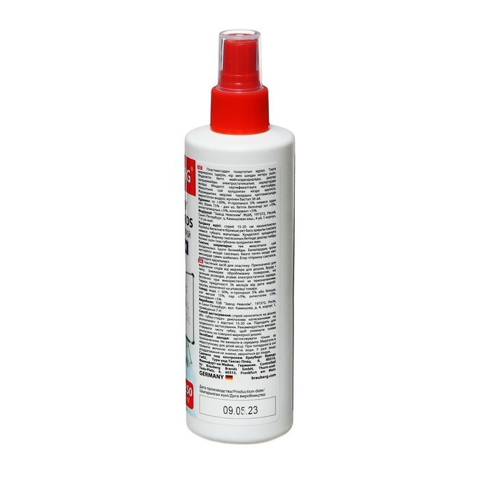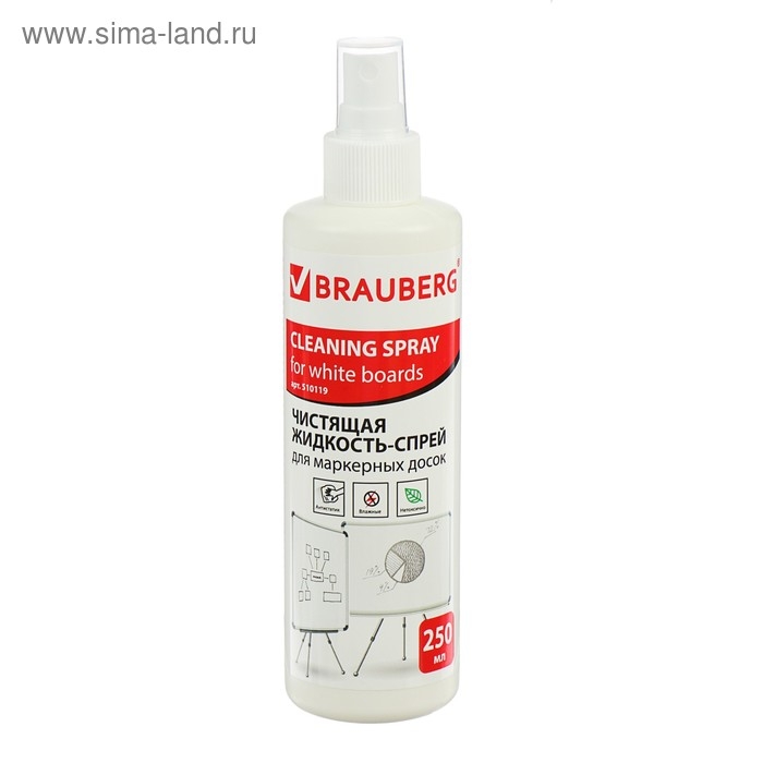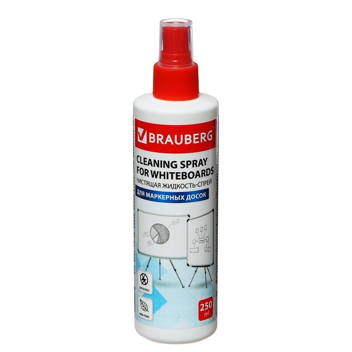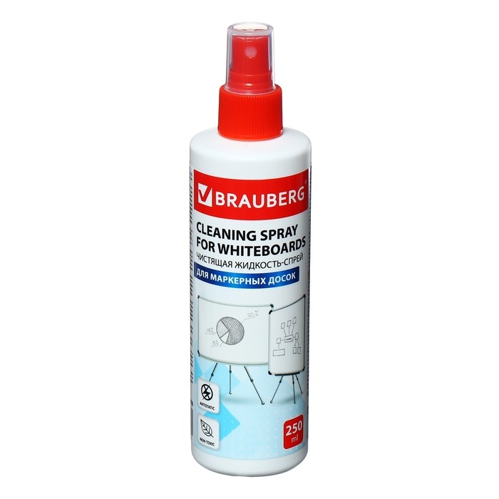 Чистящая жидкость-спрей BRAUBERG предназначена для очистки поверхности маркерных досок. Удаляет следы сухого маркера, пыли, отпечатков пальцев и других загрязнений, а также дезинфицирует поверхность.Спрей имеет объем 250 мл. Подходит для ежедневного применения. Обладает антистатическим эффектом. Рекомендуется к использованию вместе с сухими стирающими салфетками.