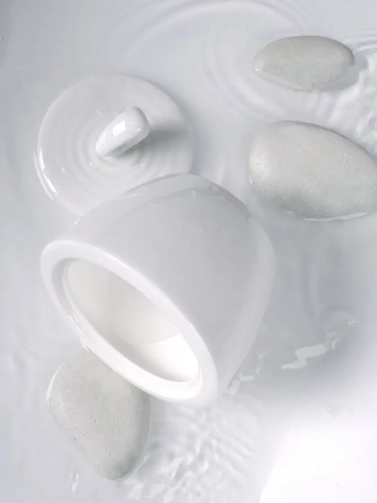 Крышка сахарницы создана в скульптурной технике: фарфор словно запечатлел сам момент движения. Необычная ручка предметов символизирует камень, от которого появляются завораживающие круги на воде.