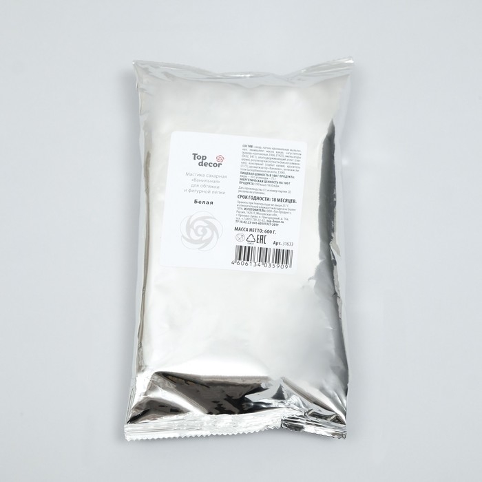 Применяется для декорирования кондитерских изделий: обтягивания тортов, пирожных, моделирования фруктов, фигурной лепки, изготовления прослойки. Обладает хорошей пластичностью, хорошо раскатывается и формуется, держит форму, легко окрашивается любым водорастворимым красителем. Украшения из сахарной мастики могут быть использованы самостоятельно как эксклюзивные изделия в вашем ассортименте.Способ применения: Необходимое количество мастики предварительно размять на сухой, слегка подпыленной сахарной пудрой поверхности, до мягкой пластичной консистенции.Состав: сахар, глюкозный сироп, эквивалент какао-масла, Е466, Е1422, глицерин, Е471, Е202, ароматизатор идентичный натуральному "ванилин".