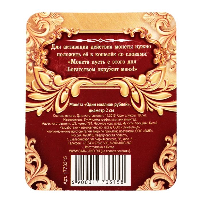 Чтобы всегда везло в денежных делах, монету можно положить в кошелёк – тогда он никогда не опустеет. Оригинальный сувенир и удачный подарок для каждого!
