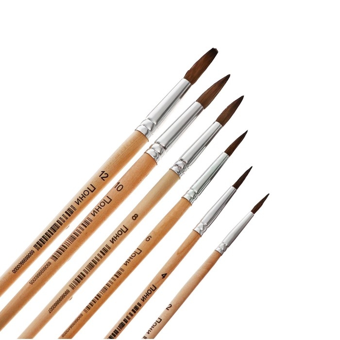 Набор кистей нейлон, круглые, средней жёсткости, 6 штук : №2, 4, 6, 8, 10, 12, с деревянными ручками, в блистере