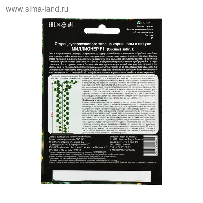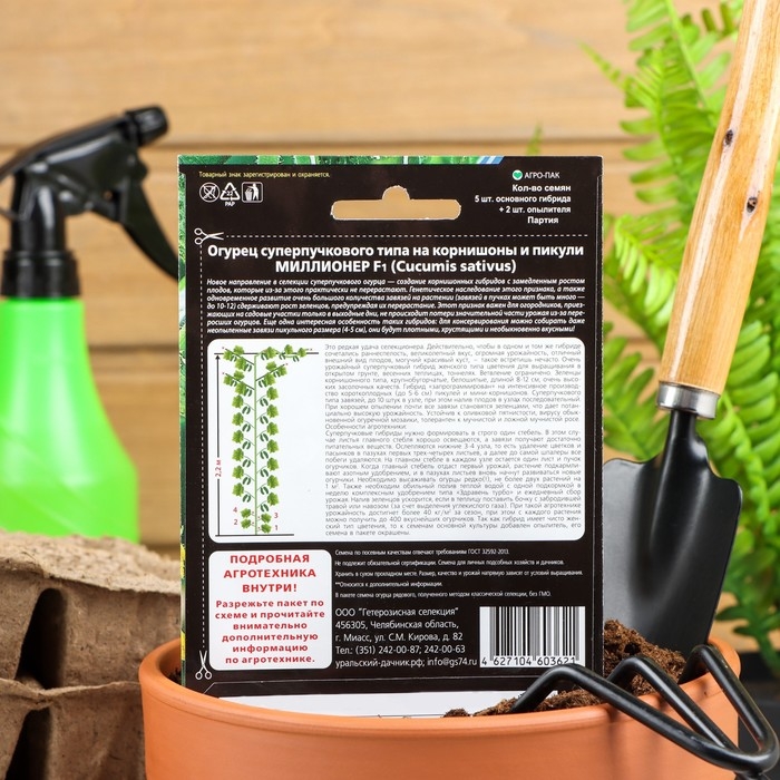 Семена Огурец "Миллионер" F1 раннеспелый, урожайный, партенокарпический, 7 шт