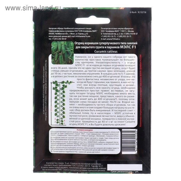 Семена Огурец "Мэлс" F1 ультраранний 36 дней, корнишон, партенокарпический, 5 шт
