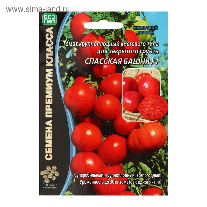 «Спасская башня» — ранний всепогодный сорт для всех видов теплиц. Среднерослые саженцы имеют кисти с овальными красно-розовыми томатами массой 200–500 г.
