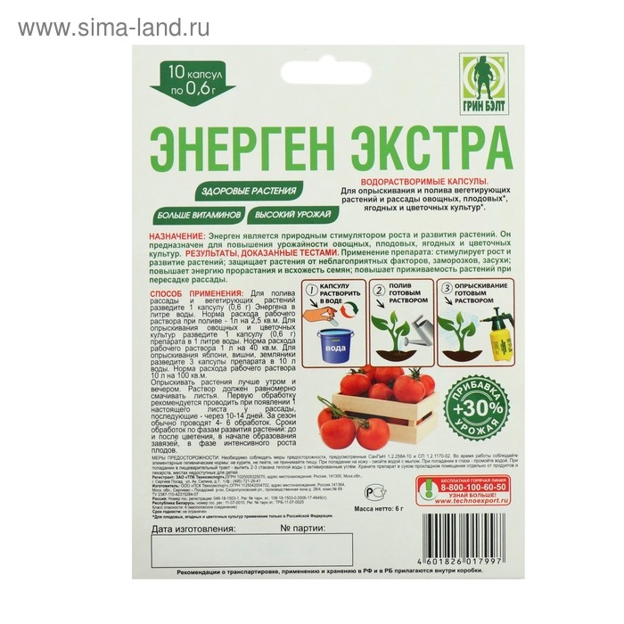- Результат действия Энергена на растение — повышение урожайности на 30-40%, увеличение содержания витаминов и других полезных веществ в овощах, ягодах и плодах, ускорение созревания на 7-10 дней.