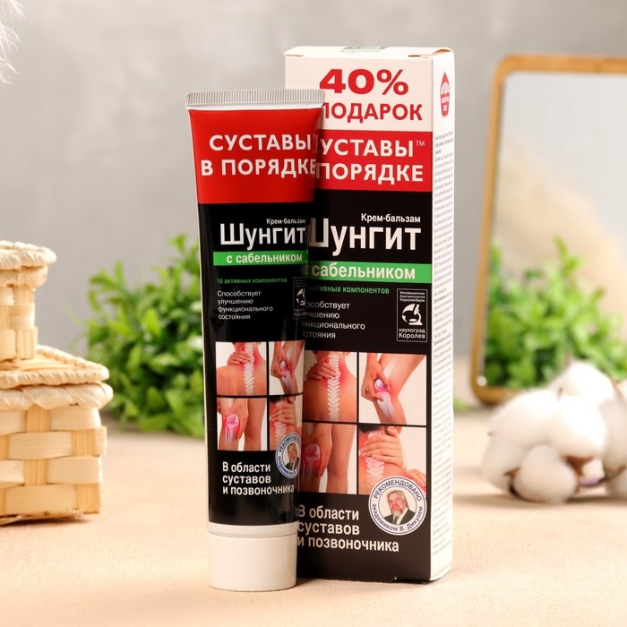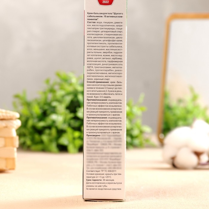 Состав: Вода, Глицерин, Диметикон М 350, Циклометикон DC 345, Масло подсолнечное, Myritol 318, Кутина GMS / Кутина GMS V, Спирт цетеариловый, Arlamol, Стеариновая кислота, Воск эмульсионный, Пропиленгликоль, Микрокар DMP /Кемабен / Sharomix DMP, Триэтаноламин, Изигель DO / Карбопол Ультрез-10, Кислота молочная, Трилон Б, Катон CG / Микрокар IT/ Шаромикс MCII , ЭПГ Сабельника (корень), Отдушка Compo №3, ЭМ полыни, Гидролизат коллаген, ЭМ зверобоя, ЭПГ алоэ, ЭПГ женьшеня, Шунгит, Масло кедровое, Мумие, Витанол.