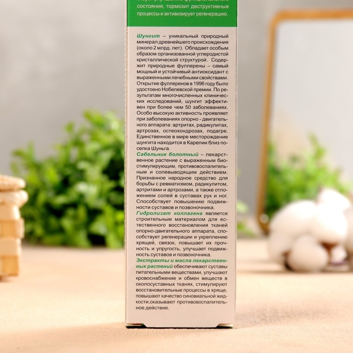 Экстракты и масла лекарственных растений - обеспечивают суставы питательными веществами, улучшает кровоснабжение и обмен веществ в околосуставных тканях, стимулируют восстановительные процессы в хряще, повышает качество синовиальной жидкости. Оказывает противовоспалительное, противоотечное, анальгезирующее действие.