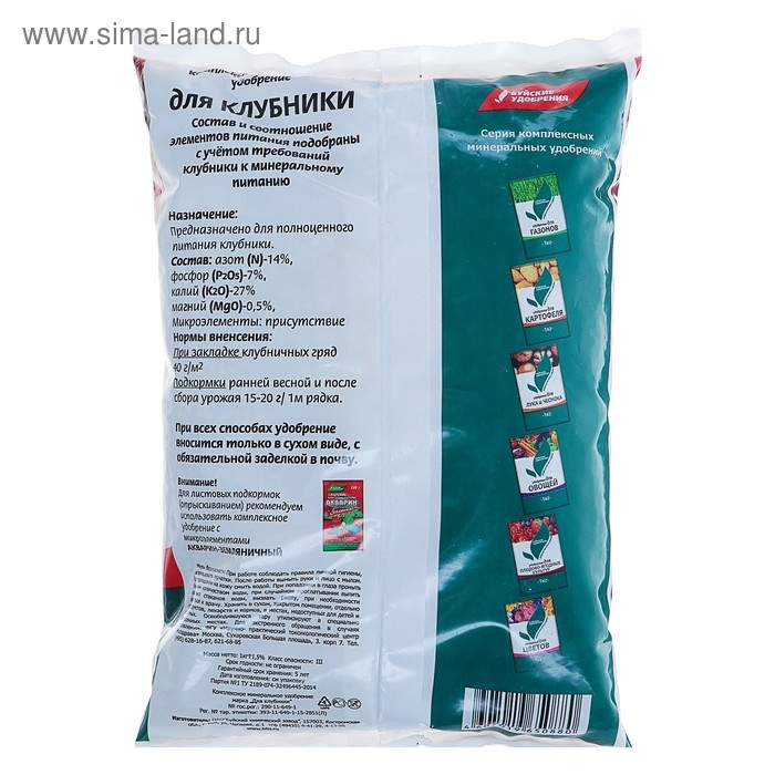 Назначение: комплексное минеральное удобрение для полноценного питания клубники. Состав и соотношение элементов питания подобраны с учетом требований клубники к минеральному питанию.