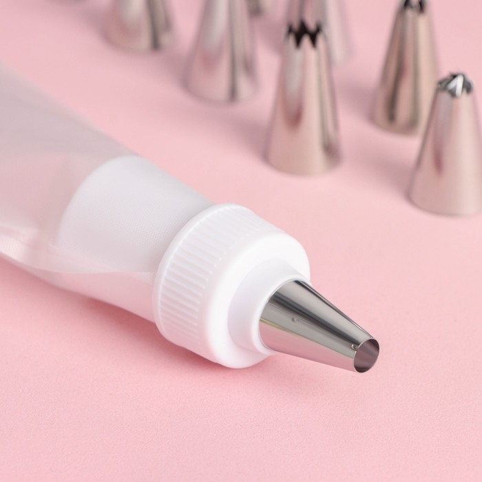Набор предназначен для украшения выпечки и готовых кондитерских изделий. Наполните мешок айсингом, кремом или мастикой, выберите насадку — и приступайте к созданию кулинарного шедевра!