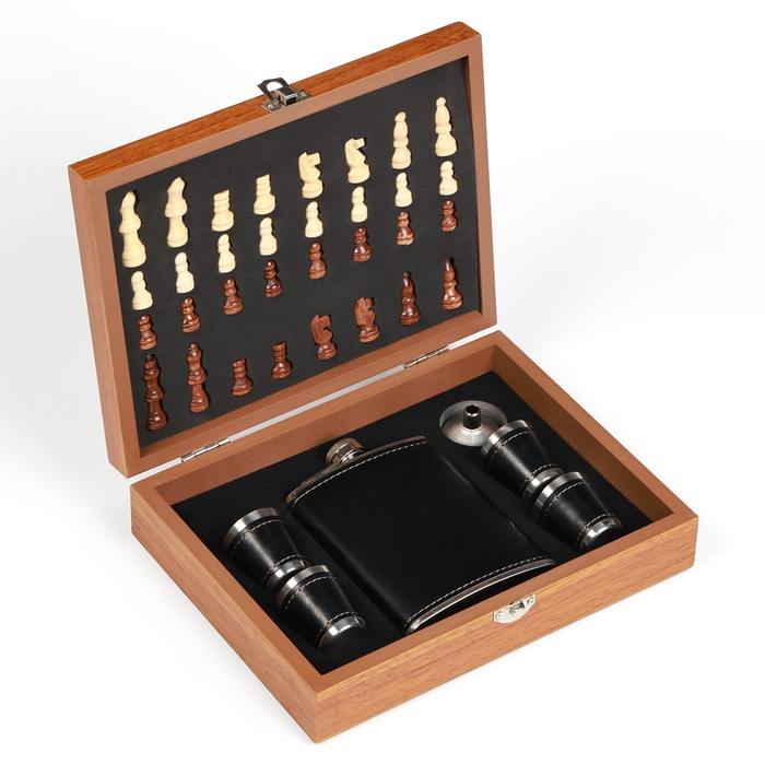 Набор 7 в 1: фляжка 8 oz, чёрная, 4 рюмки, воронка, шахматы, 18 х 24 см