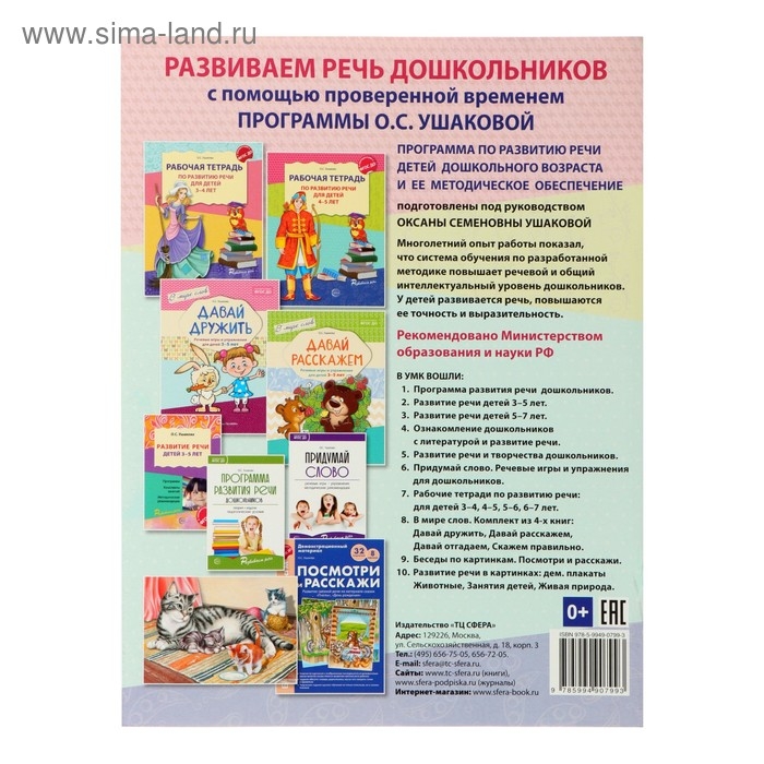 В авторской программе профессора, доктора педагогических наук Оксаны Семёновны Ушаковой «Развитие речи детей дошкольного возраста» рассмотрены возрастные особенности развития речи детей 3–7 лет. Игровая форма подачи материала помогает ребёнку формировать лексический запас, он легче усваивает грамматические категории. Принцип построения заданий, от простого к сложному, помогает развивать у детей интерес к родному языку, способствует тренировке воображения, логики и речевой активности.