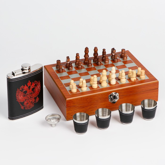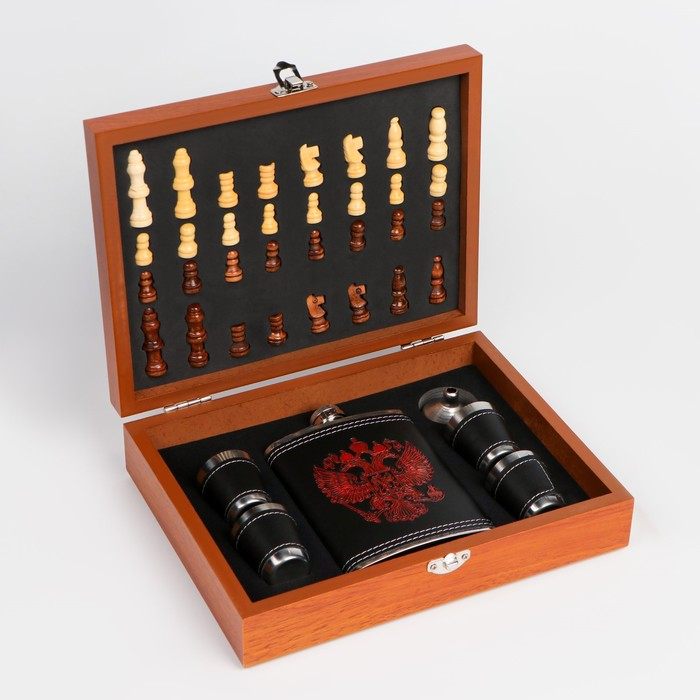 Набор 7 в 1: фляжка 8 oz, с гербом, 4 рюмки, воронка, шахматы, 18 х 24 см
