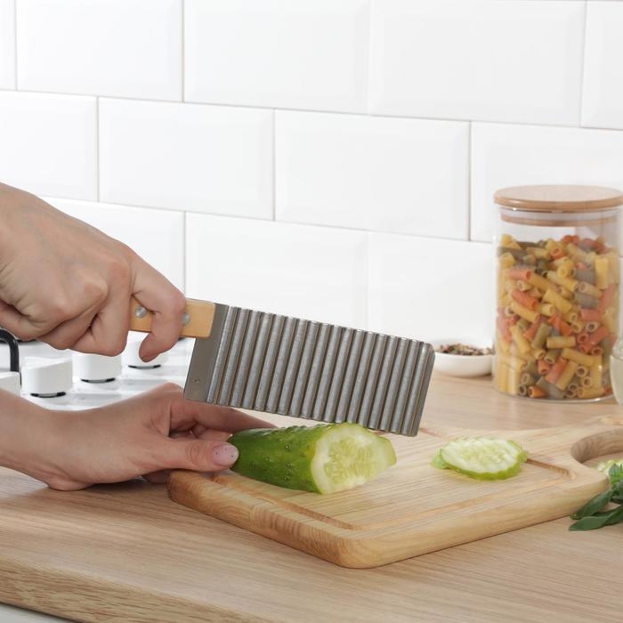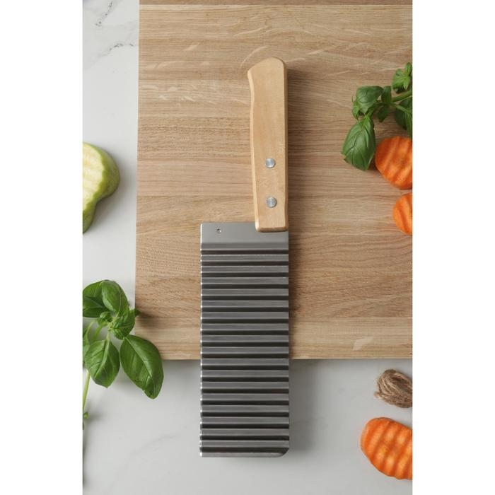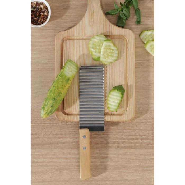 Ножи для декоративной нарезки овощей и фруктов сегодня пользуются популярностью. Изделие имеет характерное лезвие с выпуклыми зубцами по всему прямому полотну. При нарезании продуктов он придаёт поверхности ломтиков красивую волнистую форму.