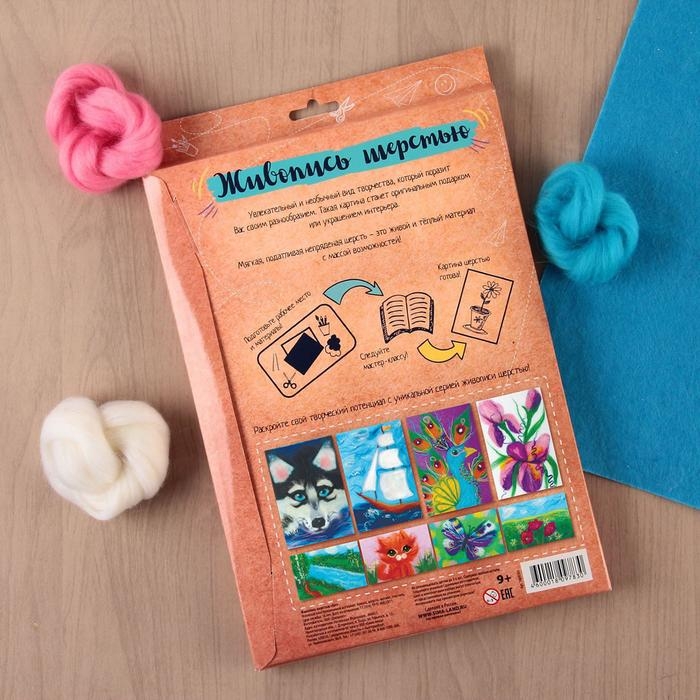 В комплекте вы найдёте лоскуты цветной шерсти, специальную иглу и лист фетра, который будет служить холстом для вашей картины. Дополнительно вам понадобятся ножницы, губка или кусок поролона и немного воды для смачивания пальцев во время работы.
