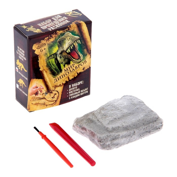 В наборе: долото, кисточка, гипсовый объект с кладом внутри.
