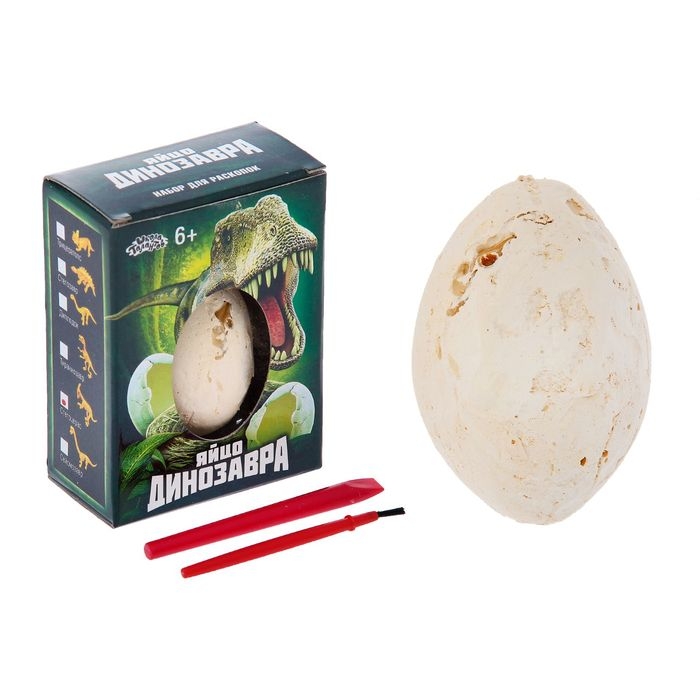 В наборе: долото, кисточка, окаменелое яйцо.