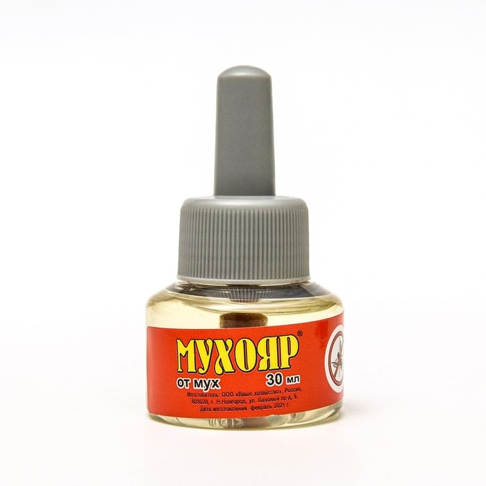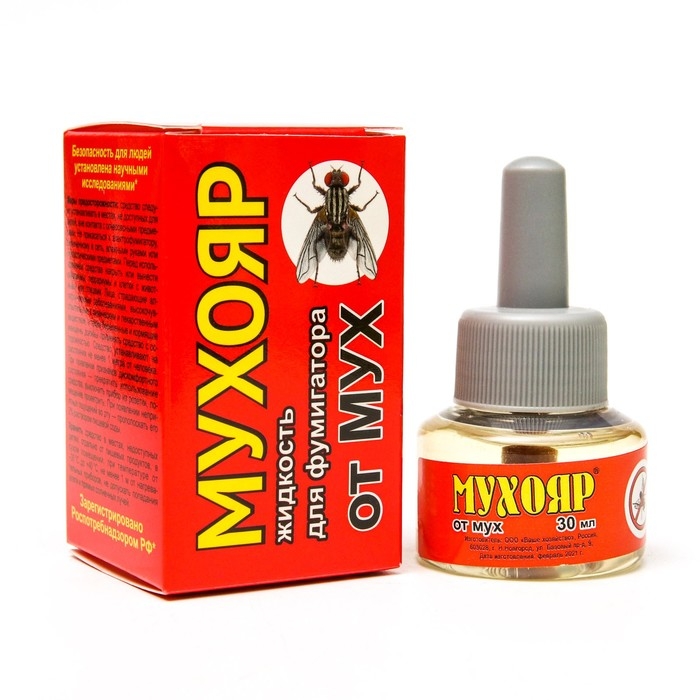 Средство инсектицидное электрофумигирующее «Мухояр» — жидкость от мух. Предназначен для уничтожения мух и других летающих насекомых (комары, москиты, бабочки, моли) в помещении. Разрешено к применению в присутствии людей. Безопасность для людей установлена научными исследованиями*.