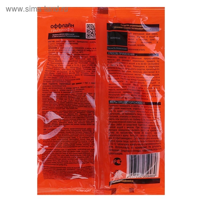 Тесто-паста Грызунофф оффлайн — эффективное средство, предназначенное для борьбы с разными видами крыс (серых и черных) и мышей (домашние и полевки). Вредителей привлекает запах и вкус теста. Грызуны умирают после поедания приманки.