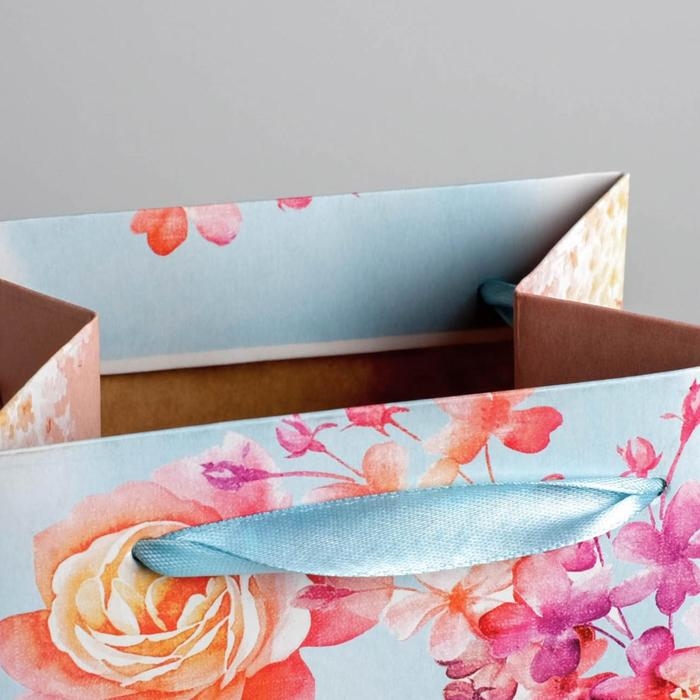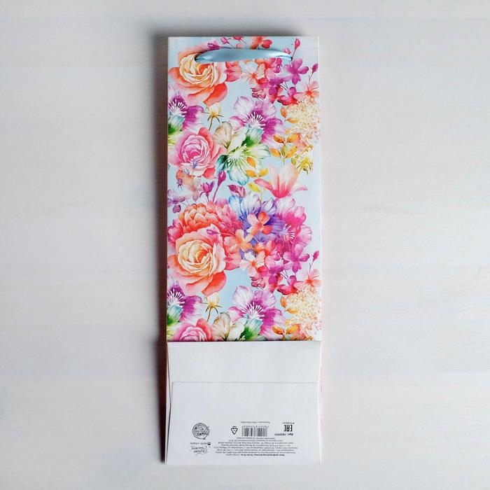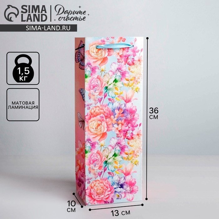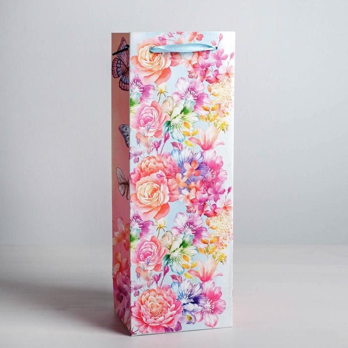 Пакет подарочный ламинированный под бутылку, упаковка, «Цветы и бабочки», 13 х 36 х 10 см
