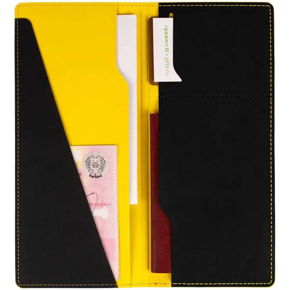 Имеет 5 отделений: для билетов, паспорта, визиток или кредитных карт.