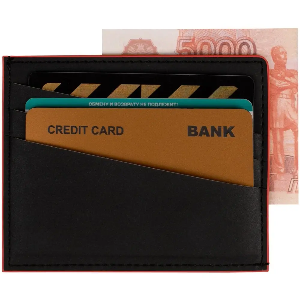 Чехол выполнен из материала Soft Touch Pearl, черный АА, дополнен окрашенным срезом края и внутренним карманом из цветного картона. Имеет 4 отделения для кредитных карт и 1 отделение для купюр.