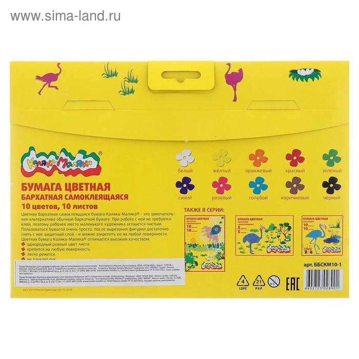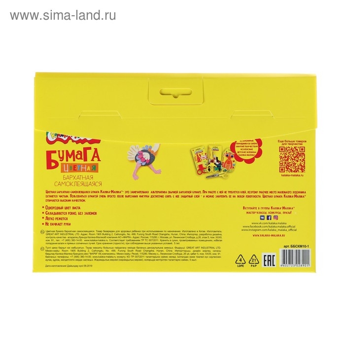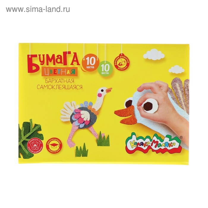 Бумага цветная самоклеящаяся бархатная 10 листов, 10 цветов "Каляка-Маляка", 175 х 250 мм