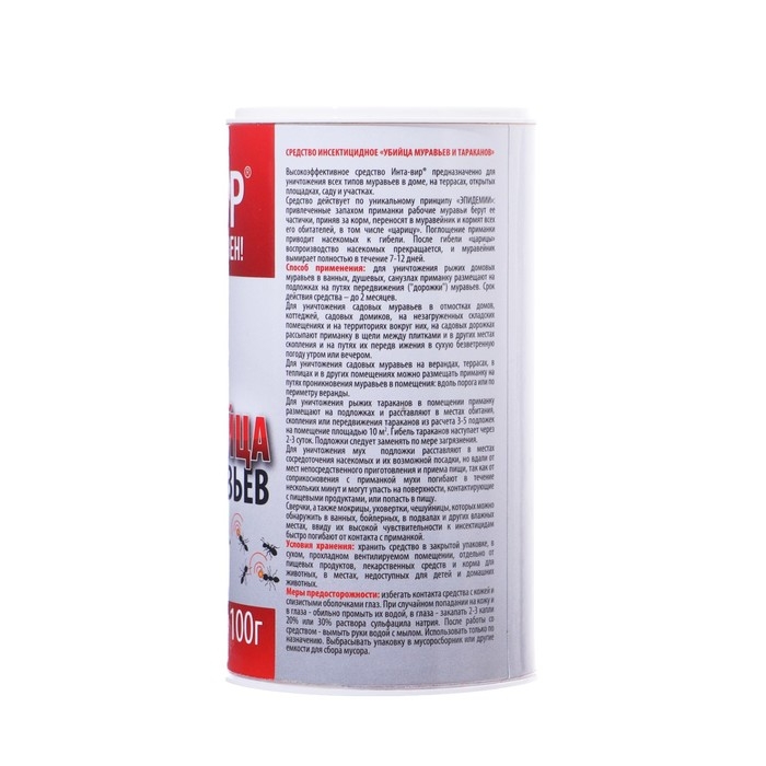 Инсектицидное средство от муравьев "Инта-вир" представляет собой эффективное средство для уничтожения муравьев в доме, на даче и в других помещениях. Препарат разработан на основе современных технологий и обладает высокой эффективностью в борьбе с муравьями.