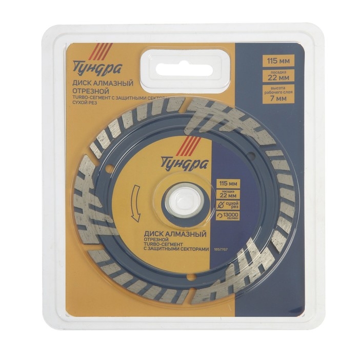 Диск алмазный отрезной ТУНДРА, TURBO-сегмент с защитными секторами, сухой рез, 115 х 22 мм