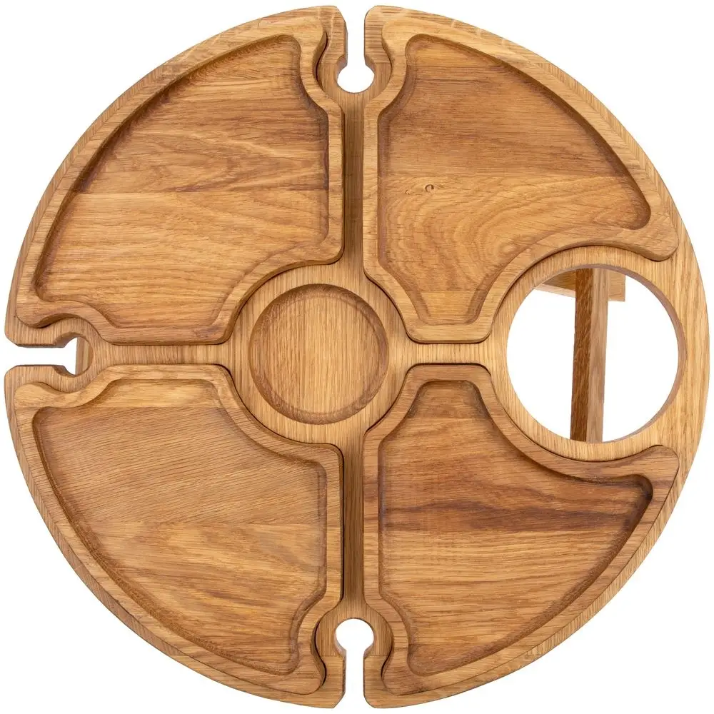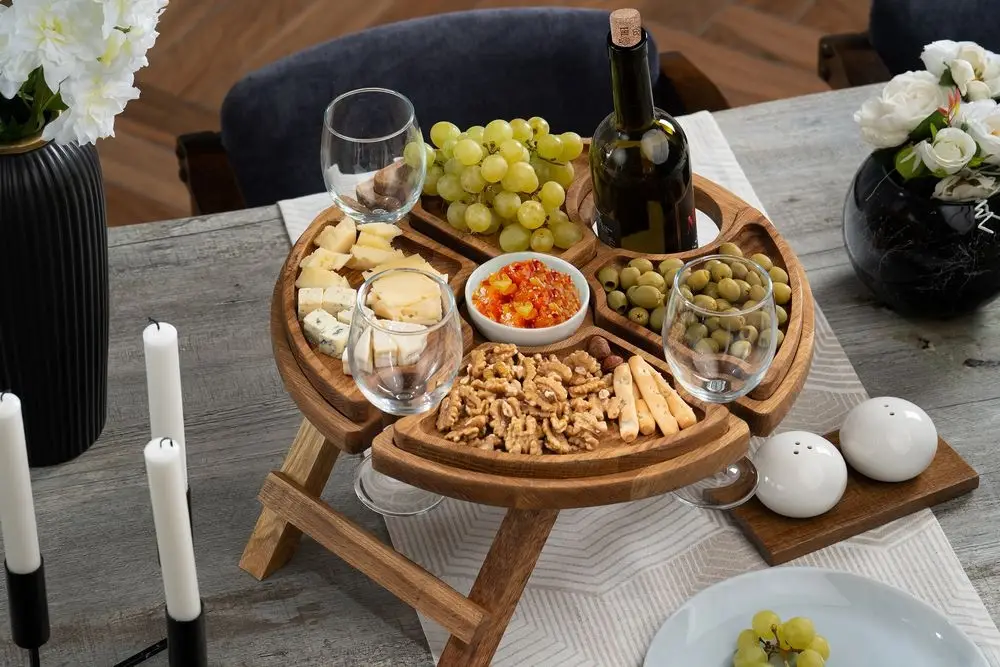 За винным столиком Chat Mode разговор польется приятно и легко, как и сам благородный напиток в бокалы. Компанию вину составит изысканная закуска, которую можно эстетично сервировать в менажницах на круглом подносе.
