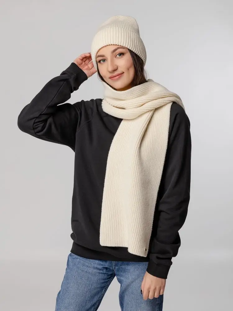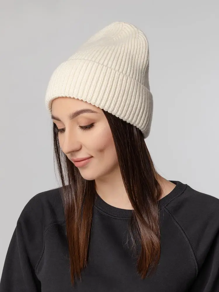 Шапка-бини из полушерстяной пряжи актуальных приглушенных оттенков. Трендовый фасон с удлиненным верхом — для расслабленного повседневного образа.