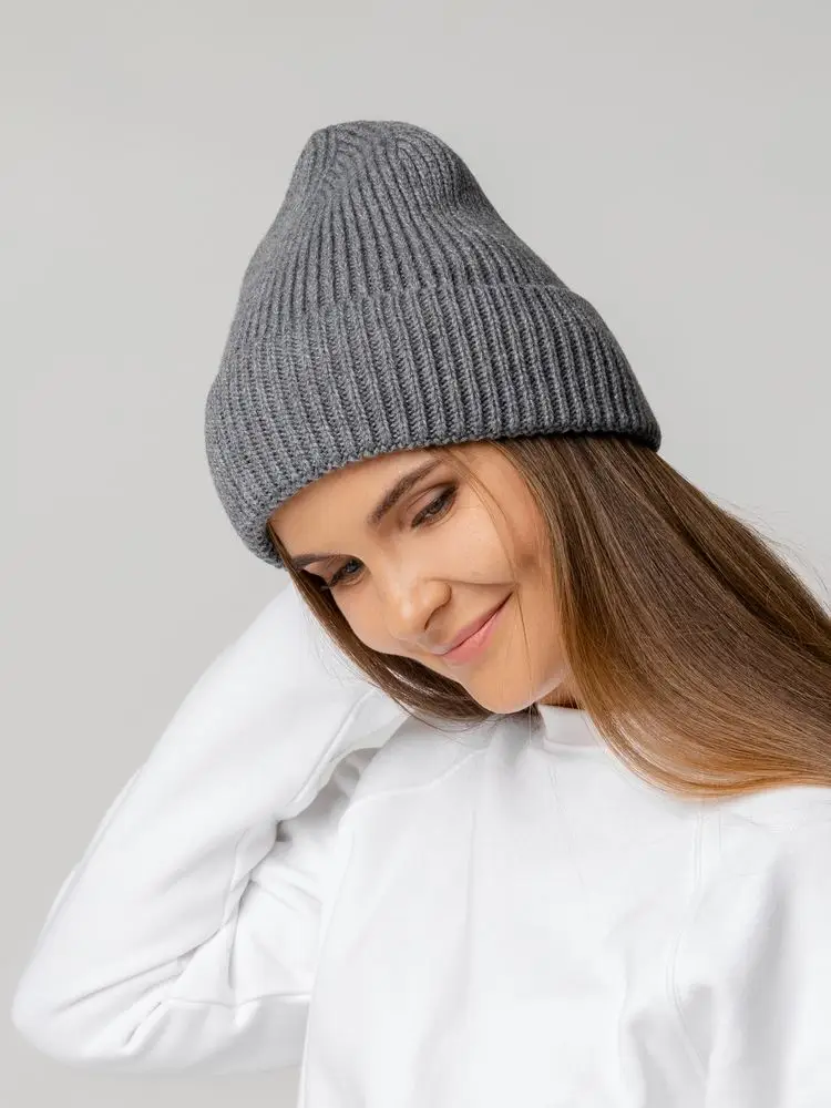 Шапка-бини из полушерстяной пряжи актуальных приглушенных оттенков. Трендовый фасон с удлиненным верхом — для расслабленного повседневного образа.