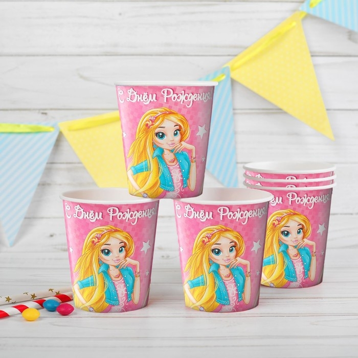 Стакан одноразовый бумажный "С Днем рождения" красотки, 250 мл. (набор 6 шт)