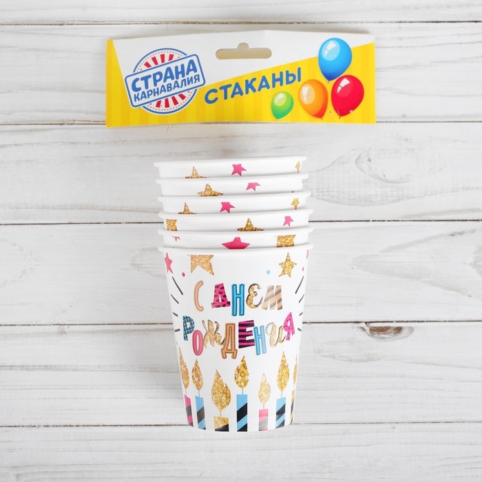 Стакан одноразовый бумажный "С Днем рождения" свечи и звезды, 250 мл. (набор 6 шт.)