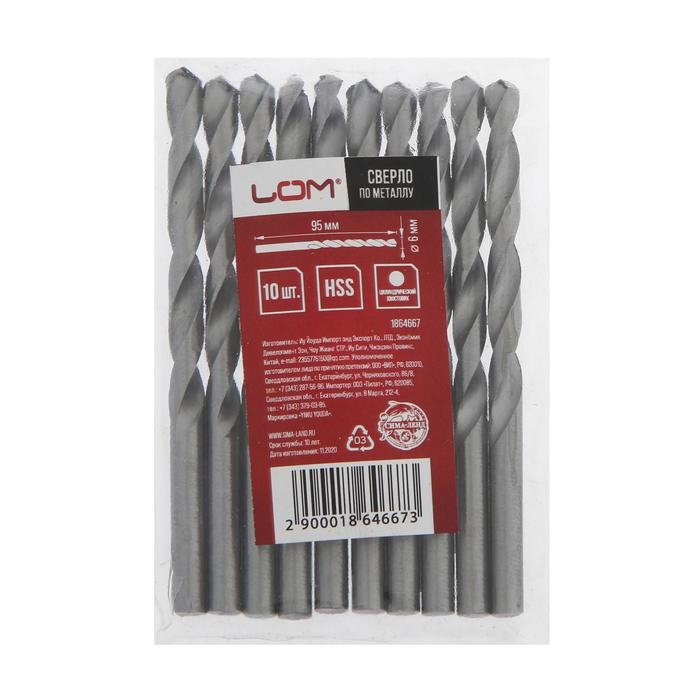 Сверло по металлу ЛОМ, HSS, цилиндрический хвостовик, 6 х 95 мм, 10 шт.