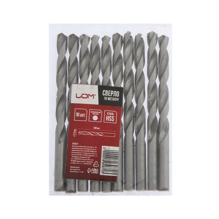 Сверло по металлу ЛОМ, HSS, цилиндрический хвостовик, 7.5 х 110 мм, 10 шт.