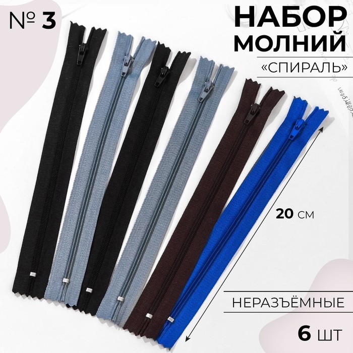 Набор молний «Спираль», №3, неразъёмные, 20 см, 6 шт, цвет разноцветный