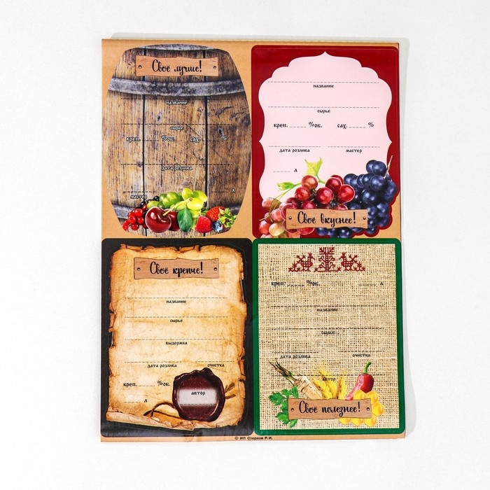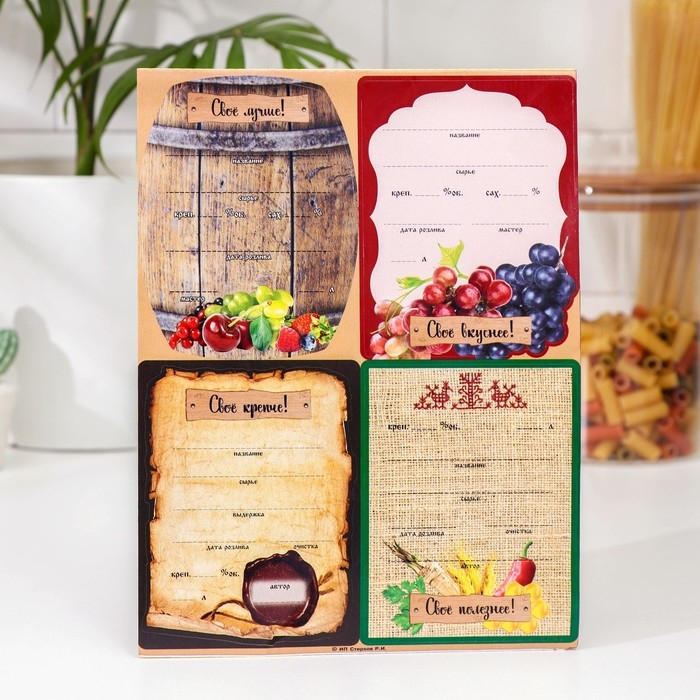 Набор цветных этикеток для домашнего виноделия поможет навести порядок в кладовой или винном погребе. В набор входит 24 этикетки с изображениями спелых ягод, фруктов и винных бочек с надписями.