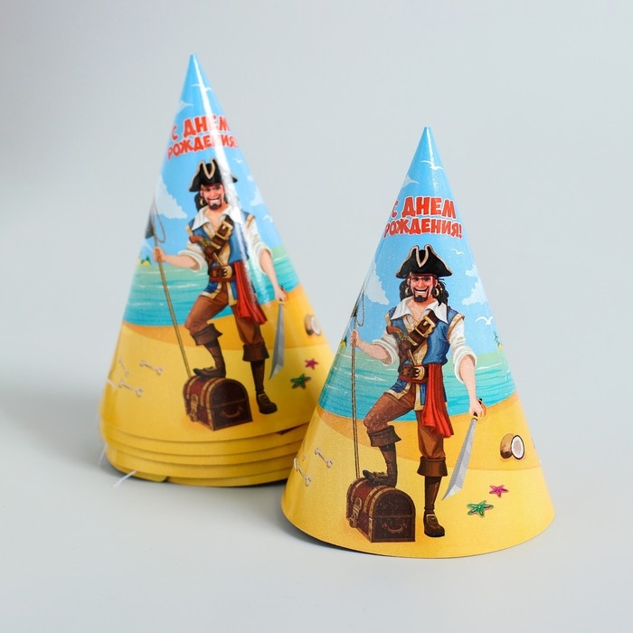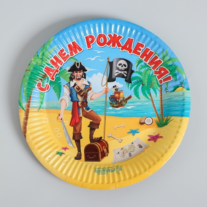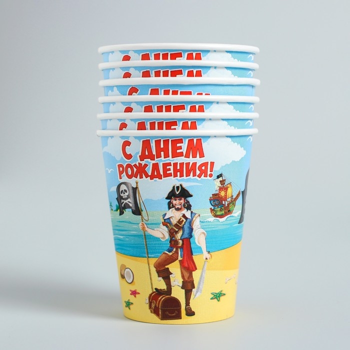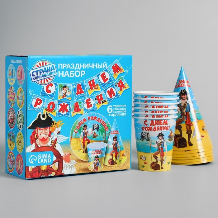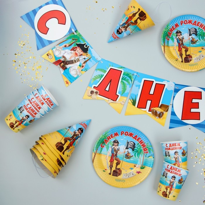 Набор бумажной посуды одноразовый С днём рождения. Бравый пират», 6 тарелок, 6 стаканов, 6 колпаков, 1 гирлянда