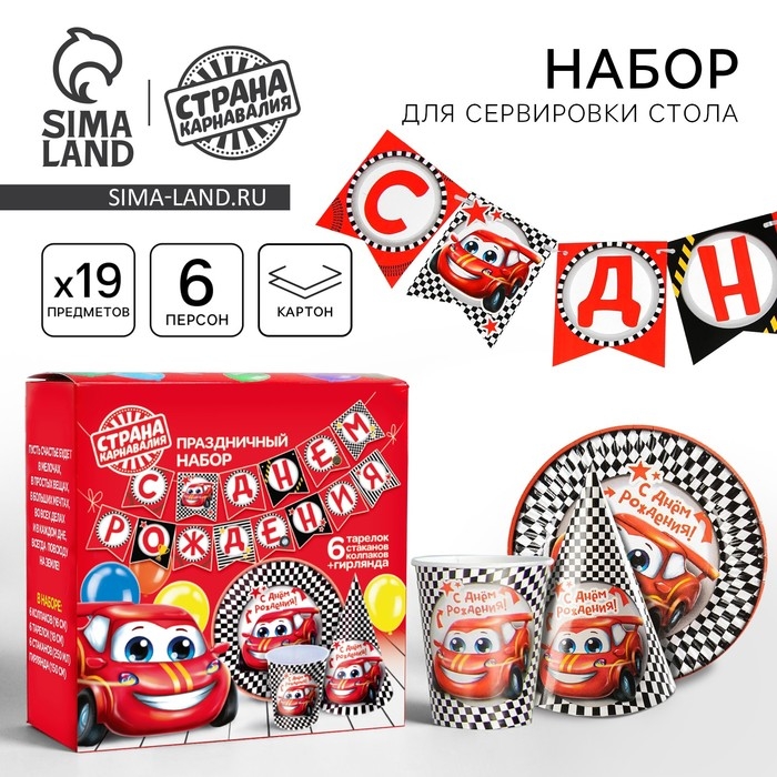 Набор бумажной посуды одноразовый С днём рождения. Тачка», 6 тарелок, 6 стаканов, 6 колпаков, 1 гирлянда