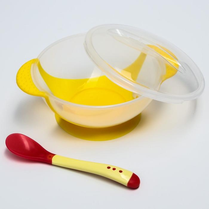 Набор для кормления, 3 предмета: миска 350 мл на присоске, крышка, термоложка, цвет жёлтый