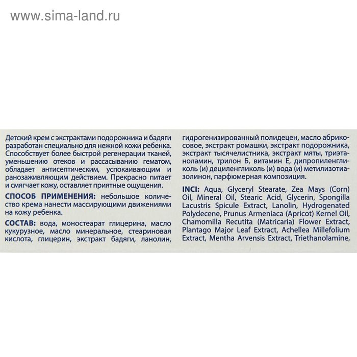 Детский крем с экстрактами подорожника и бадяги разработан специально для нежной кожи ребёнка. Средство ускоряет восстановление тканей, уменьшает отёки и устраняет гематомы. Обладает антисептическим, успокаивающим и ранозаживляющим действием. Питает и смягчает кожу.