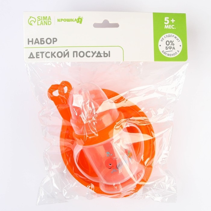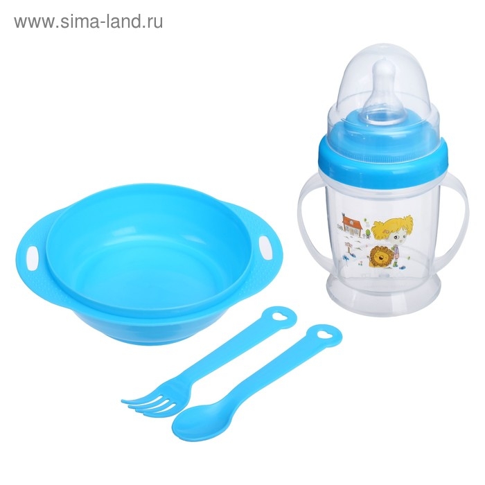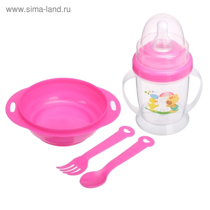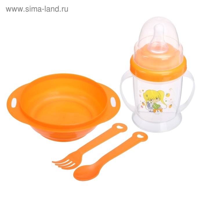 Набор детской посуды, 4 предмета: миска 200 мл, бутылочка для кормления 180 мл, ложка, вилка, цвета МИКС