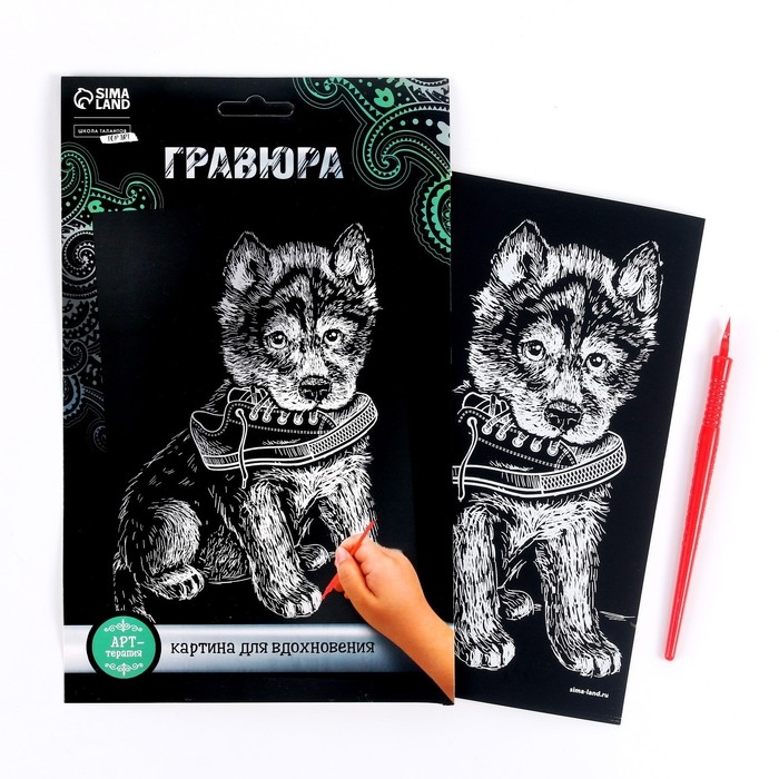 Гравюра представляет собой многослойное панно, покрытое чёрной краской, на которое нанесён контур рисунка. С помощью особого скребка (штихеля), который входит в набор, путём процарапывания и создается гравюра. Новая серия с уникальным дизайном порадует вас разнообразием рисунков.