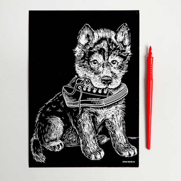 Гравюра «Щенок с ботинком» с металлическим эффектом «серебро» А5
