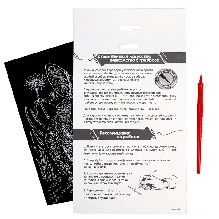 Гравюра представляет собой многослойное панно, покрытое чёрной краской, на которое нанесён контур рисунка. С помощью особого скребка (штихеля), который входит в набор, путём процарапывания и создается гравюра. Новая серия с уникальным дизайном порадует вас разнообразием рисунков.