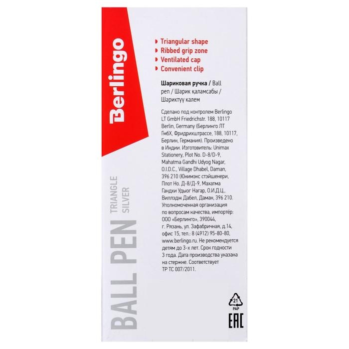 Одноразовая трехгранная шариковая ручка Berlingo Triangle Silver с колпачком и пластиковым клипом выполнена в строгих классических цветах и станет отличным помощником в работе. Рифление в зоне захвата позволяет удобно держать ручку и препятствует скольжению пальцев при письме. Цвет чернил – синий. Диаметр пишущего узла составляет 1 мм, благодаря чему ручка идеально подходит для быстрого стиля письма. Толщина линии письма составляет 0,5 мм, а длина линии письма – 850 м. Цвет чернил: синий, Толщина линии письма: 0,5 мм, Длина письма: 850 м, Цвет корпуса: серебристый.