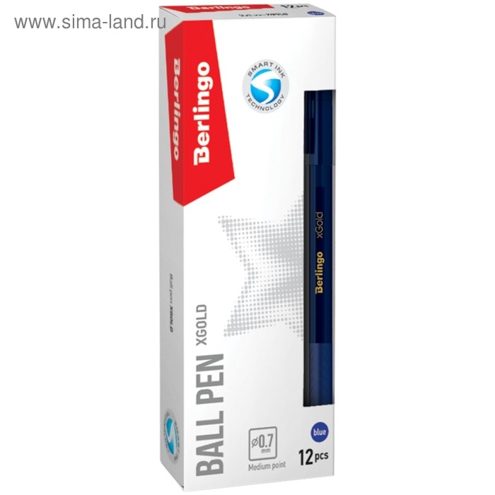 Ручка шариковая Berlingo xGold – это флагманская модель ассортимента Berlingo. 12 штук в упаковке. Цвет чернил: синий. Толщина линии письма: 0,5 мм. Длина письма: 850 м. Не раз становилась официальной ручкой «Тотального диктанта» – ежегодной образовательной акции популяризации грамотности. Кроме того, xGold является обладателем премии «Выбор канцелярского рынка 2018». Ручка оснащена вентилируемым колпачком, который обеспечивает безопасность при использовании детьми. Удобный пластиковый клип позволяет закрепить ручку, например, на ежедневнике или тетради. Мягкий резиновый грип препятствует скольжению пальцев и обеспечивает комфортное письмо. Диаметр пишущего узла составляет 0,7 мм, благодаря чему ручка прекрасно подходит для любого стиля письма.Уникальная запатентованная технология Smart Ink обеспечивает лёгкое и приятное письмо за счёт использования чернил пониженной вязкости, специальной конструкции пишущего узла и инновационных материалов шарика и пишущего узла. Инновационные компоненты, используемые для изготовления шарика пишущего узла (карбид вольфрама), обеспечивают долговечность и стабильность качества письма. Технология Smart Ink, Цвет чернил: синий, Толщина линии письма: 0,5 мм, Длина письма: 850 м, Цвет корпуса: синий.